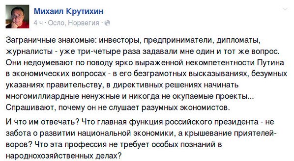 «Заграничные знакомые: инвесторы, предприниматели, дипломаты, журналисты – уже три-четыре раза задавали мне один и тот же вопрос. Они недоумевают по поводу ярко выраженной некомпетентности Путина в экономических вопросах – в его безграмотных высказываниях, безумных указаниях правительству, в директивных решениях начинать многомиллиардные ненужные и никогда не окупаемые проекты... Спрашивают, почему он не слушает разумных экономистов.